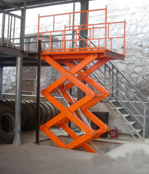 SJG固定式液壓升降平臺是靠剪刀式支承架的展開與折疊來完成貨物平臺的升降,其動力是通過油缸的伸縮來推動剪刀的展開與折疊。