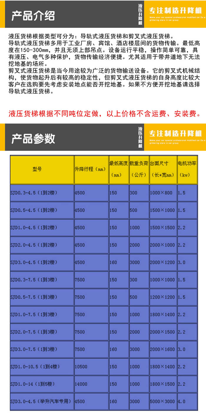 4、設(shè)備可按客戶提供的承載重量、起升高度、平臺(tái)尺寸或預(yù)留空間尺寸、使用場(chǎng)所非標(biāo)訂制;