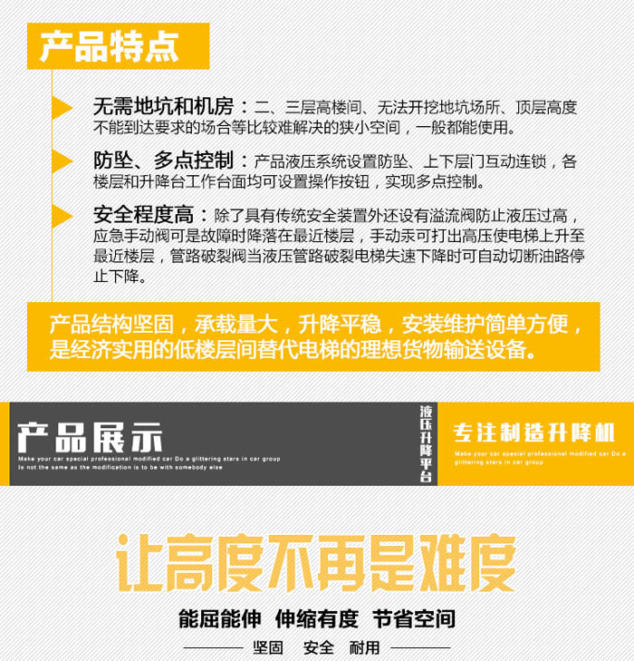 4、設(shè)備可按客戶提供的承載重量、起升高度、平臺(tái)尺寸或預(yù)留空間尺寸、使用場(chǎng)所非標(biāo)訂制;